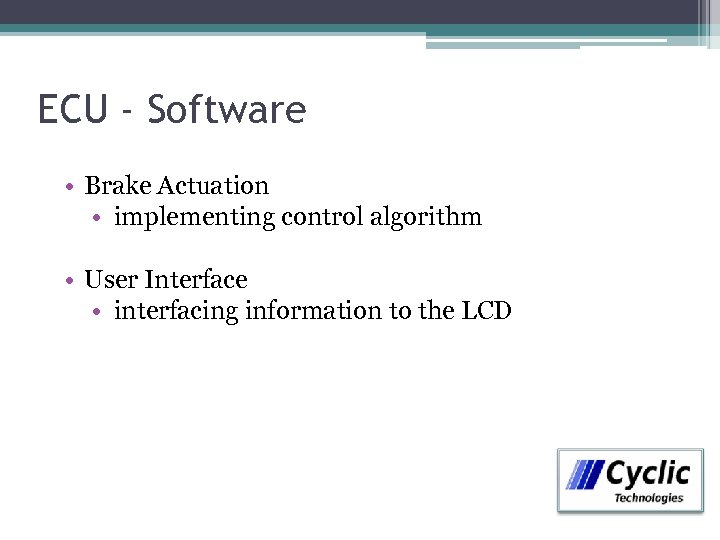 ECU - Software • Brake Actuation • implementing control algorithm • User Interface • interfacing information to the LCD