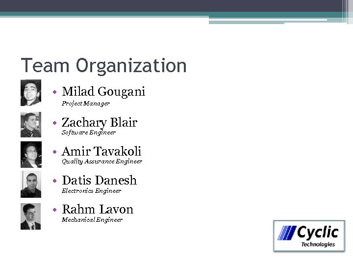 Team Organization • Milad Gougani Project Manager • Zachary Blair Software Engineer • Amir Tavakoli Quality Assurance Engineer • Datis Danesh Electronics Engineer • Rahm Lavon Mechanical Engineer