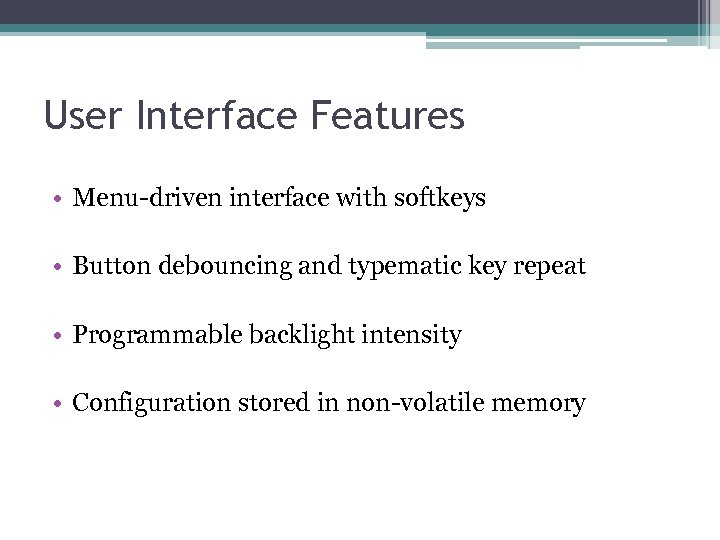 User Interface Features • Menu-driven interface with softkeys • Button debouncing and typematic key repeat • Programmable backlight intensity • Configuration stored in non-volatile memory