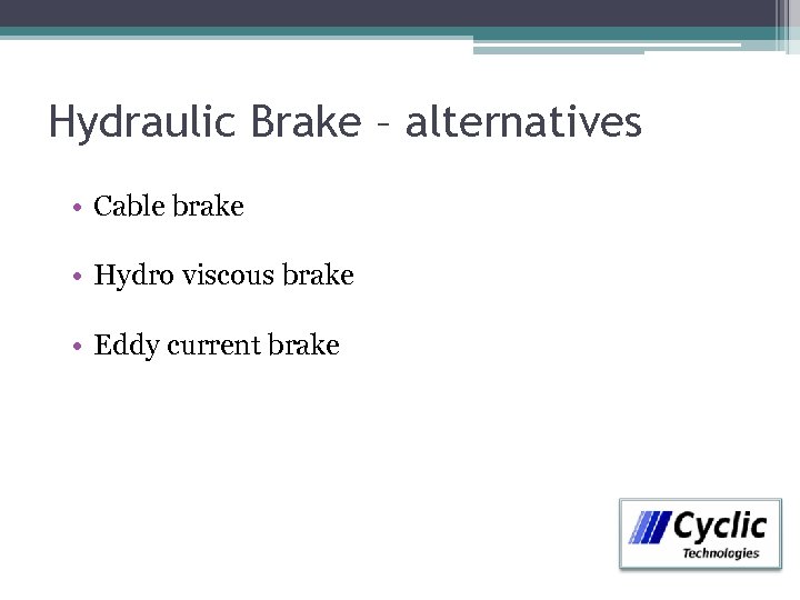 Hydraulic Brake – alternatives • Cable brake • Hydro viscous brake • Eddy current brake
