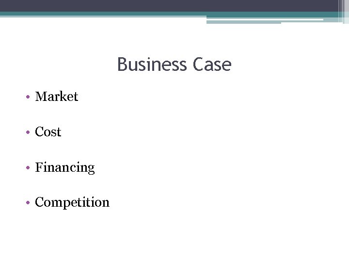 Business Case • Market • Cost • Financing • Competition