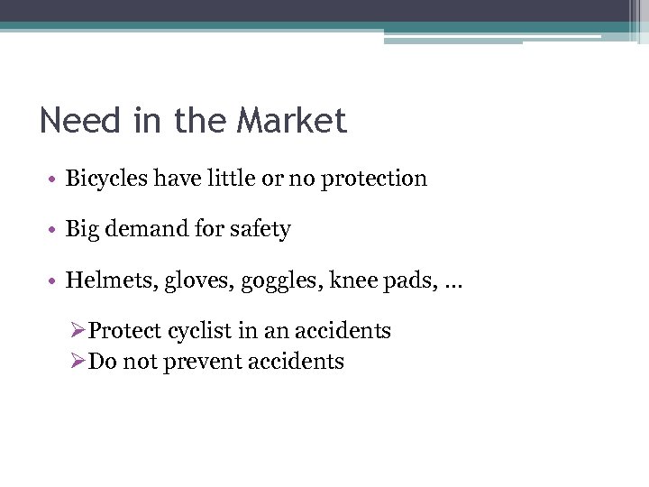 Need in the Market • Bicycles have little or no protection • Big demand for safety • Helmets, gloves, goggles, knee pads, … ØProtect cyclist in an accidents ØDo not prevent accidents
