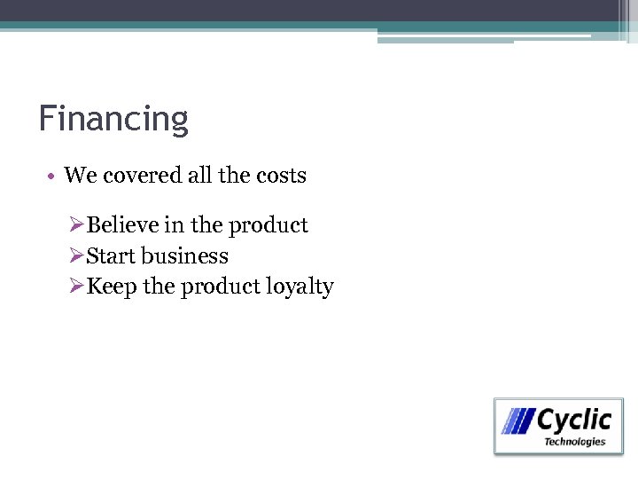 Financing • We covered all the costs ØBelieve in the product ØStart business ØKeep the product loyalty