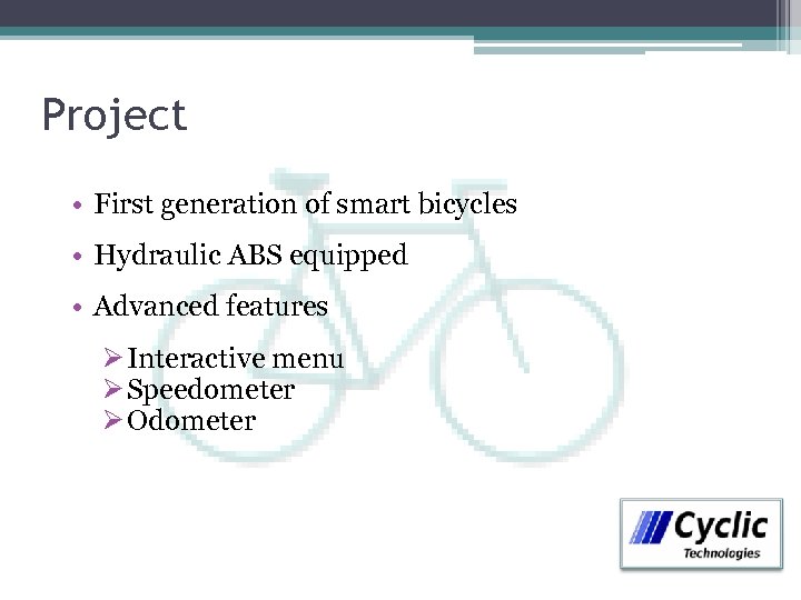 Project • First generation of smart bicycles • Hydraulic ABS equipped • Advanced features Ø Interactive menu Ø Speedometer Ø Odometer