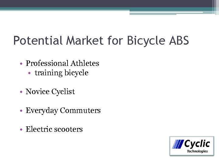 Potential Market for Bicycle ABS • Professional Athletes • training bicycle • Novice Cyclist • Everyday Commuters • Electric scooters