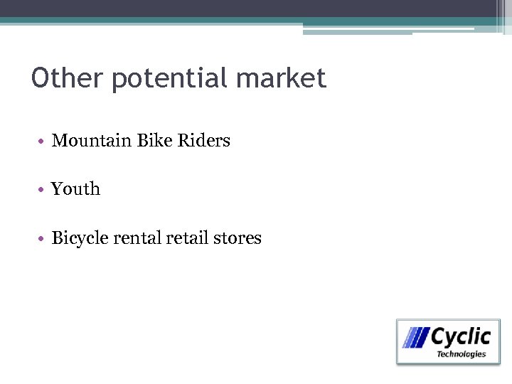 Other potential market • Mountain Bike Riders • Youth • Bicycle rental retail stores