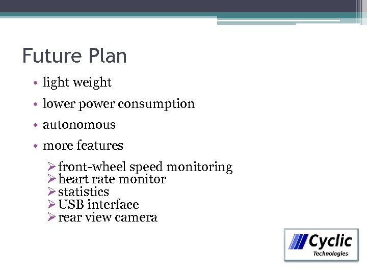 Future Plan • light weight • lower power consumption • autonomous • more features Ø front-wheel speed monitoring Ø heart rate monitor Ø statistics Ø USB interface Ø rear view camera
