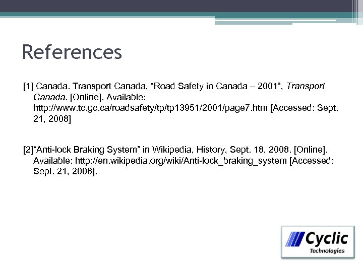References [1] Canada. Transport Canada, “Road Safety in Canada – 2001”, Transport Canada. [Online]. Available: http: //www. tc. gc. ca/roadsafety/tp/tp 13951/2001/page 7. htm [Accessed: Sept. 21, 2008] [2]“Anti-lock Braking System” in Wikipedia, History, Sept. 18, 2008. [Online]. Available: http: //en. wikipedia. org/wiki/Anti-lock_braking_system [Accessed: Sept. 21, 2008].