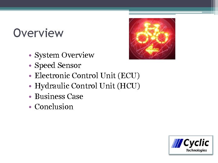 Overview • • • System Overview Speed Sensor Electronic Control Unit (ECU) Hydraulic Control Unit (HCU) Business Case Conclusion