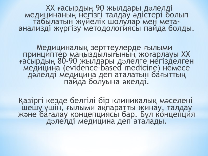 ДӘЛЕЛДІ МЕДИЦИНА ТҮСІНІГІНЕ АНЫҚТАМА 1990 жылы Мак Мастер университетінің (Торонто, Канада) ғалымдарымен (Sackett et al.) «evidence-based medicine», «Дәлелге негізделген медицина» - деген ұғым енгізілді. Әуелде дәлелге негізделген медицина немесе дәлелді медицина – «жеке бір науқасты не болмаса науқастар тобын емдеу кезінде шешімдерді нақты, ар-ұждан, түсінікпен қабылдау» деген мағына берсе (Sackett, D.L.,1996)., кейіннен дәлелді медицинаның мағынасы «клиникалық тәжірибе және науқас қажеттіліктерін ақтайтын зерттеу нәтижелерін интеграциялау» деген анықтамаға ие болды (Sackett, D.L. 2000).