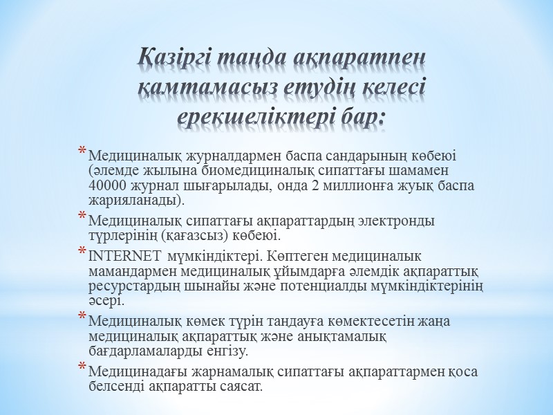Қазіргі таңда ақпаратпен қамтамасыз етудің келесі ерекшеліктері бар: Медициналық журналдармен баспа сандарының көбеюі (әлемде жылына биомедициналық сипаттағы шамамен 40000 журнал шығарылады, онда 2 миллионға жуық баспа жарияланады). Медициналық сипаттағы ақпараттардың электронды түрлерінің (қағазсыз) көбеюі. INTERNET мүмкіндіктері. Көптеген медициналык мамандармен медициналық ұйымдарға әлемдік ақпараттық ресурстардың шынайы және потенциалды мүмкіндіктерінің әсері. Медициналық көмек түрін таңдауға көмектесетін жаңа медициналық ақпараттық және анықтамалық бағдарламаларды енгізу. Медицинадағы жарнамалық сипаттағы ақпараттармен қоса белсенді ақпаратты саясат.