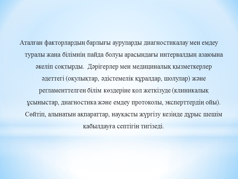 Аталған факторлардың барлығы ауруларды диагностикалау мен емдеу туралы жаңа білімнің пайда болуы арасындағы интервалдың азаюына әкеліп соқтырды. Дәрігерлер мен медициналық қызметкерлер әдеттегі (оқулықтар, әдістемелік құралдар, шолулар) және регламенттелген білім көздеріне қол жеткізуде (клиникалық ұсыныстар, диагностика және емдеу протоколы, эксперттердің ойы). Сөйтіп, алынатын ақпараттар, науқасты жүргізу кезінде дұрыс шешім қабылдауға септігін тигізеді.