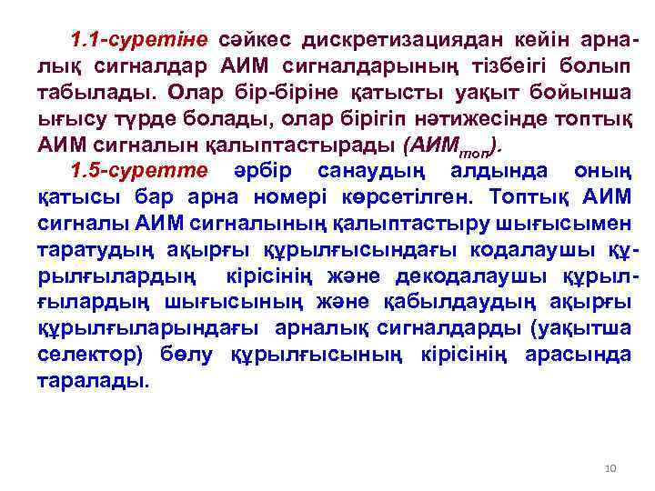 1. 2 Сигналдарды уақыт бойынша дискреттеу. Арналарды уақытша бөлуі бар тарату жүйелеріде әрбір арнаның сигналы бастапқы сигналмен модуляцияланған импульстердің периоды тізбегін құрайды. Әдетте амплитудалық-импульсті модуляция қолданылады. Мұнда импульстер амплитудасы модуляцияланады, ал басқа параметрлер (ұзақтығы, орындау жиілігі, уақытша жағдайы) өзгеріссіз қалады (1. 2 сурет). 5