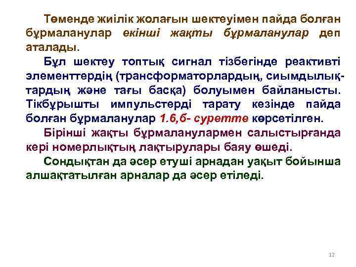 Төменде жиілік жолағын шектеуімен пайда болған бұрмаланулар екінші жақты бұрмаланулар деп аталады. Бұл шектеу топтық сигнал тізбегінде реактивті элементтердің (трансформаторлардың, сиымдылықтардың және тағы басқа) болуымен байланысты. Тікбұрышты импульстерді тарату кезінде пайда болған бұрмаланулар 1. 6, б- суретте көрсетілген. Бірінші жақты бұрмаланулармен салыстырғанда кері номерлықтың лақтырулары баяу өшеді. Сондықтан да әсер етуші арнадан уақыт бойынша алшақтатылған арналар да әсер етіледі. 12