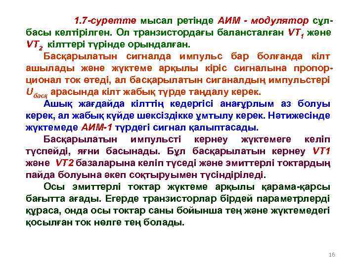 1. 7 -суретте мысал ретінде АИМ - модулятор сұлбасы келтірілген. Ол транзистордағы балансталған VT 1 және VT 2 кілттері түрінде орындалған. Басқарылатын сигналда импульс бар болғанда кілт ашылады және жүктеме арқылы кіріс сигналына пропорционал ток өтеді, ал басқарылатын сиганалдың импульстері Uбасқ арасында кілт жабық түрде таңдалу керек. Ашық жағдайда кілттің кедергісі анағұрлым аз болуы керек, ал жабық күйде шексіздікке ұмтылу керек. Нәтижесінде жүктемеде АИМ-1 түрдегі сигнал қалыптасады. Басқарылатын импульсті кернеу жүктемеге келіп түспейді, яғни басынады. Бұл басқарылатын кернеу VT 1 және VT 2 базаларына келіп түседі және эмиттерлі токтардың пайда болуына әкеп соқтыруымен түсіндіріледі. Осы эмиттерлі токтар жүктеме арқылы қарама-қарсы бағытта ағады. Егерде транзисторлар бірдей параметрлерді құраса, онда осы токтар саны бойынша тең және жүктемедегі қосылған ток нөлге тең болады. 16