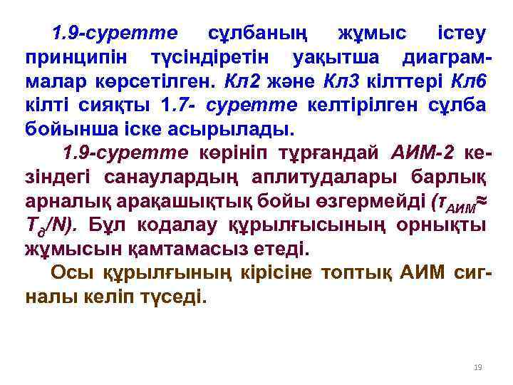 1. 9 -суретте сұлбаның жұмыс істеу принципін түсіндіретін уақытша диаграммалар көрсетілген. Кл 2 және Кл 3 кілттері Кл 6 кілті сияқты 1. 7 - суретте келтірілген сұлба бойынша іске асырылады. 1. 9 -суретте көрініп тұрғандай АИМ-2 кезіндегі санаулардың аплитудалары барлық арналық арақашықтық бойы өзгермейді (τАИМ≈ Тд/N). Бұл кодалау құрылғысының орнықты жұмысын қамтамасыз етеді. Осы құрылғының кірісіне топтық АИМ сигналы келіп түседі. 19
