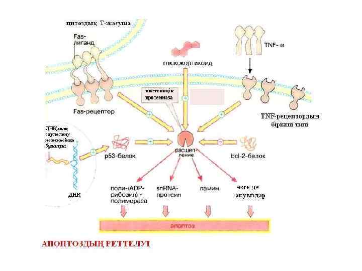 Апоптоздың реттелуіне сыртқы факторлар және автономды механизмдер қатысады: - вирустық инфекциялар, - пролиферацияның бұзылуы (бақылау нүктелері: ), - жасушаның зақымдалуы және т. б. жатады. Цистеин-аспартат протеазалар басқаша каспазалар деп аталады.