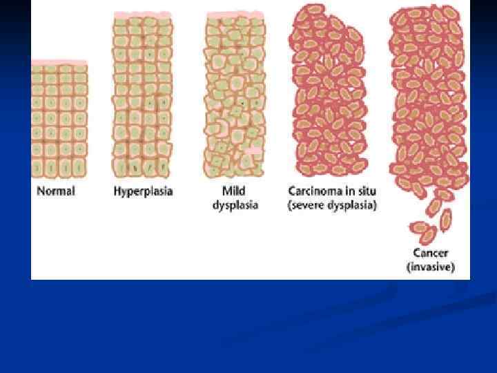 n. Дисплазия – атипияның дамуына байланысты жасушалардың пролиферациясының және дифференцировкасының бұзылуы. Жасуша архитектоникасының бұзылуы Дисплазияның сатылары: - Жеңіл (кіші) - Орташа - Ауыр n n