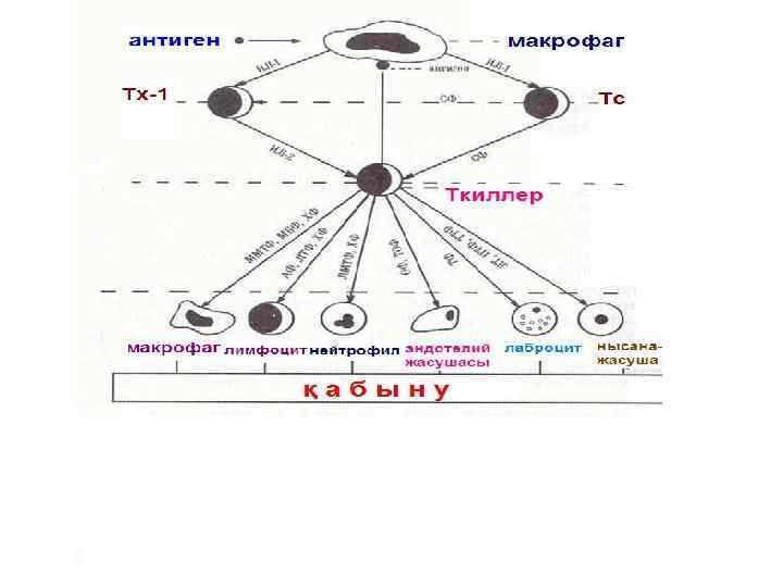 • Иммундық серпілістер сатысында + макрофаг Аллерген IL-12 Тх1 IL-1 Тх0 IL-2 Тжендет Тх2 IL-4, 5, 6, 9, 10 В-Лимфоцит Макрофаг БДЖС Плазмалық жасуша Иммундық глобулиндер (Ig A, M, G, E)
