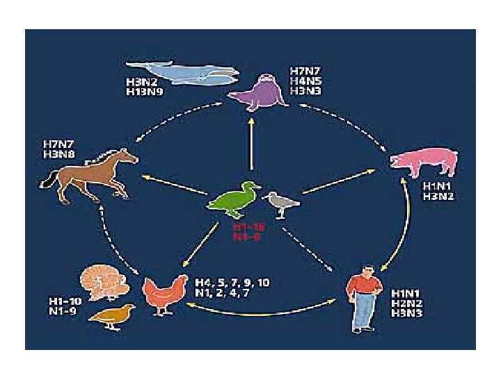 АНТИГЕНДІК ҚҰРЫЛЫМЫ: • • Геном – бір жіпшелі сызықтық РНҚ; Антигендік тұрақсыз; 4 түрлі антигенін ажыратады; Нуклеокапсидтік (Np) және мембраналық (М) антигендер (тұрақты). • Беткейлік антигендер: гемагглютинин (Н) және нейраминидаза (N) – тұрақсыз.