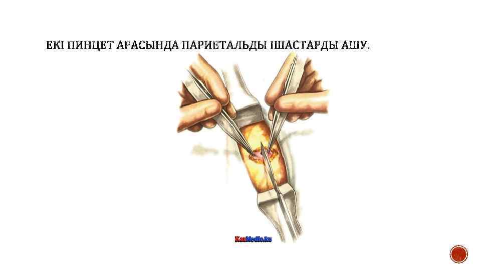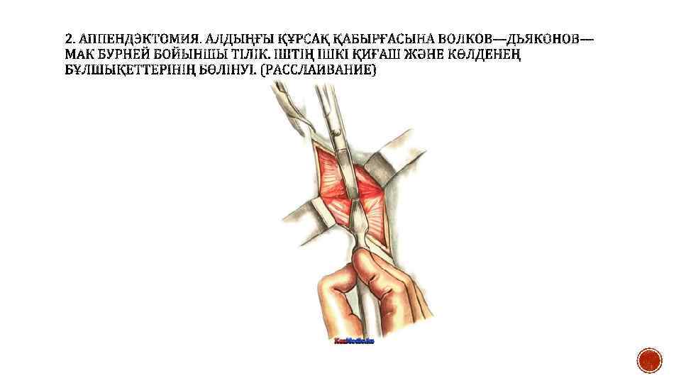 § Алдыңғы құрсақ қабырғасына Волков—Дьяконов—Мак Бурней бойыншы тілік жасайды. Тері және тері асты клечаткасын ашады, қан аққан тамырларды қысқыш арқылы қысып, жіңішке кетгутпен байлайды. Терілік жара шеттеріне дәке салады және Кохер зонды бойынша немесе пинцетпен іштің сыртқы қиғаш бұлшықетінің апоневроз талшықтарының бойымен ашады. Ашылған апоневроз шеттерін қысқышпен шетіне қарай тартады, перимизиді ашады және ішкі көлденең, қиғаш бұлшықеттерін талшық бойымен ашады. Терілік жара бойымен бұлшықеттерді тартады, кейін париетальды ішпердемен бірге алдыңғы құрсақ клечаткасын итереді. Ішпердені екі анатомиялық пинцетпен қамтып оны конус тәрізді көтеріп, аздаған биіктікте скальпель немесе қайшымен кеседі. Құрсақ кесіндісін жоғары және төмен қарай кеңейтеді. Ішперде шеттеріне Микулич қысқышымен дәкелі салфеткаларды фиксациялайды.