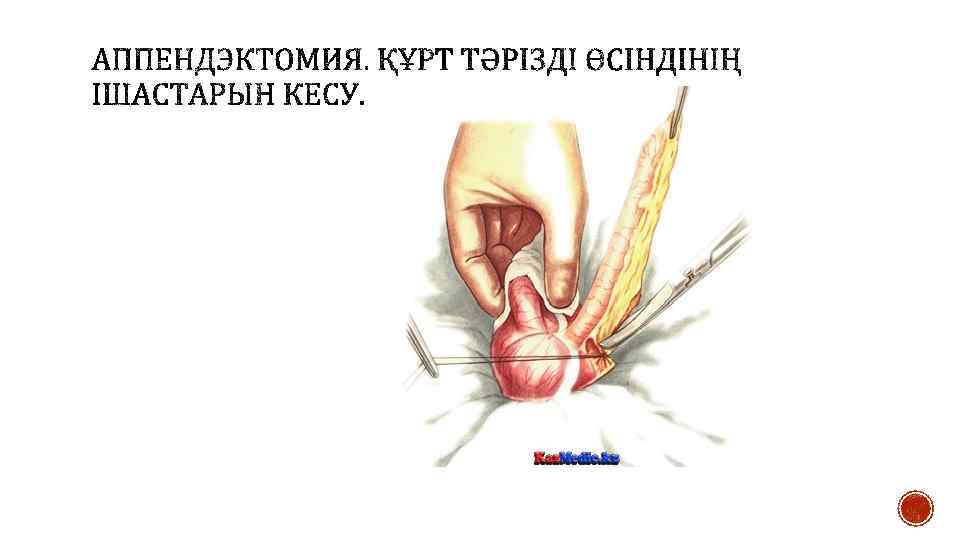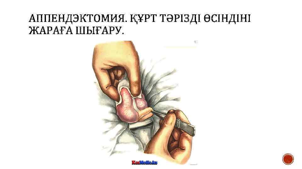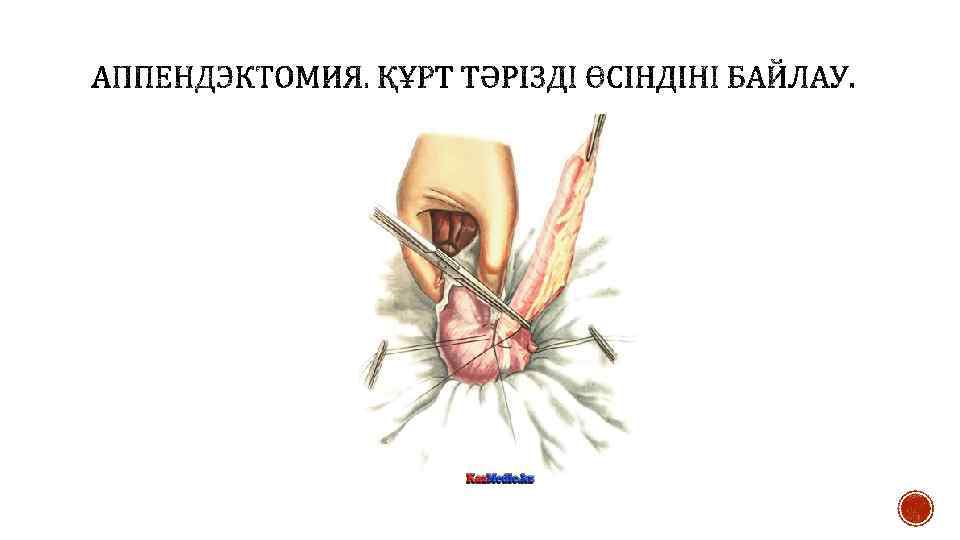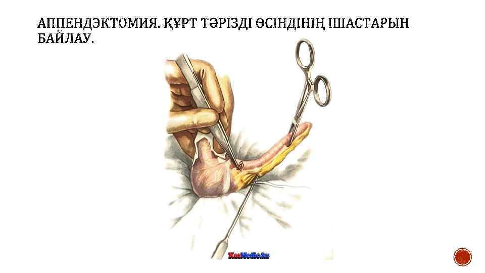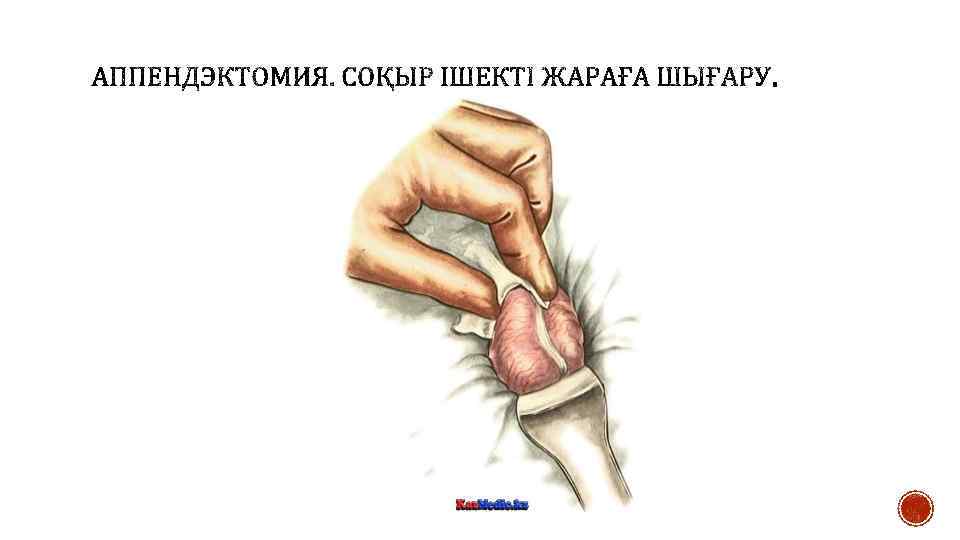 § Құрсақ қуысында экссудат болған жағдайда оны аспират немесе дәкелі салфеткамен сорып алады. Жара шеттерін өткір емес ілмек арқылы ашады. Кейін соқыр ішекті табады және ақырын анатомиялық пинцет арқылы ұстайды, жараға шығарады және дәкелі салфеткамен ұстайды. Егер құрт тәрізді өсінді ішекпен бірге жараға шығарылмаған жағдайда оны іздеу үшін ішекті taenia libera бойынша алып жараның төменгі бұрышында өсінді негізі пайда болғанша іздейді. Өсінді ішпердесіне 5— 6 мл 0, 5 % новокаин ерітіндісін енгізеді. Кейін құрт тәрізді өсіндіні ақырындап анатомиялық пинцет арқылы ұстап, құрсақ қуысынан алып шығарады. Егер құрт тәрізді өсінді жараға шығарылмаған жағдайда оны сұқ саусақпен шығарады. Егер болбырлы өсінді болса оны ақырын ағытады, ал тығыз өсінділер болса қысқыш арасында ағытады. Шығарылған өсіндіні ішперденің жоғары шыңына жақын жерде салынған жұмсақ Шами қысқышымен фиксациялайды. Одан кейін жуан жібек немесе кетгут жіптерімен Дешан инесі арқылы немесе қан тоқтатқыш қысқыш арқылы өсінді негізінде ішпердені байлайды. Егер ішперде байлауы үшін кетгут жіптері қолданылса, оны міндетті түрде үш түйінмен байлайды. Ішпердеге лигатураны тым төмен орналастыруға болмайды, себебі соқыр ішекті қамтамасыз ететін артериалды тармақтар байланып тасталуы мүмкін. Қысқа ішперде болған жағдайда оны екі – үш аймақпен байлайды. Жіптердің шеттерін қысқышқа алады және қайшымен құрт тәрізді өсіндіге жақынырақ ішпердені кеседі.
