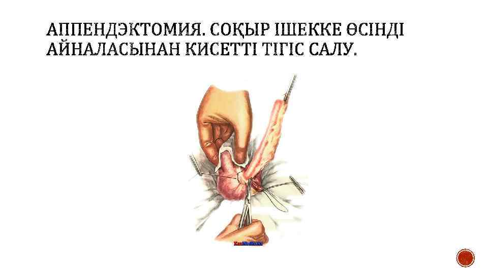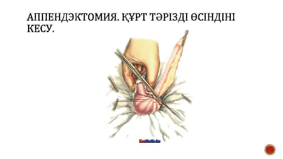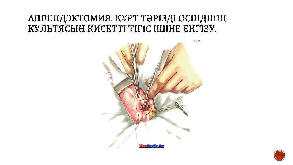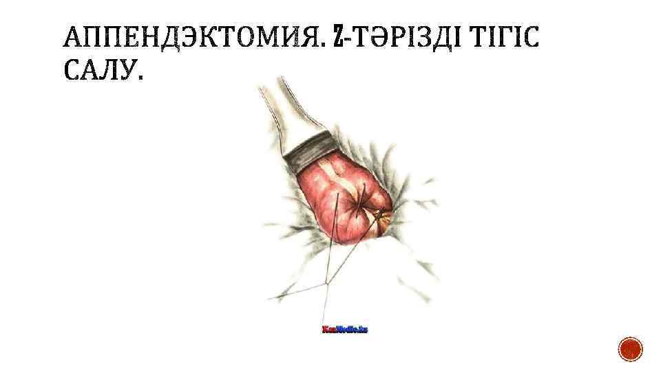 § Өсінді мобилизациясынан кейін одан соқыр ішекке 1— 1, 5 см қашықтықта жіңішке жібекпен серозды- бұлшықеттік кисетті тігіс салады. Өсінді негізін екі Кохер қысқышымен қысады. Олардың біреуі — төменгі — шешеді және пайда болған жүлге бойынша өсіндіні кетгут жібімен байлайды. Лигатура және екінші қысқыш арасынан құрт тәрізді өсіндіні скальпель арқылы кеседі, ал культяға йод ерітіндісін жағып кисетті тігіске енгізеді. Кейде кисетті тігіс үстіне үлкен герметикалық үшін Z-тәрізді тігіс салады.
