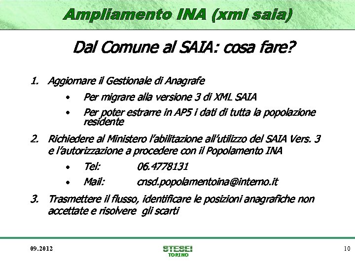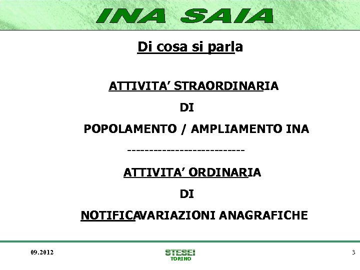 Di cosa si parla ATTIVITA’ STRAORDINARIA DI POPOLAMENTO / AMPLIAMENTO INA -------------ATTIVITA’ ORDINARIA DI NOTIFICAVARIAZIONI ANAGRAFICHE 09. 2012 TORINO 3
