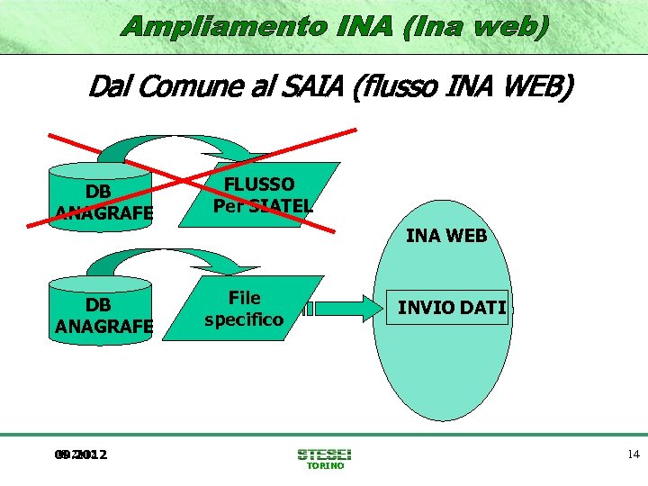 Dal Comune al SAIA (flusso INA WEB) DB ANAGRAFE FLUSSO Per SIATEL INA WEB DB ANAGRAFE 09. 2012 File specifico INVIO DATI TORINO 14