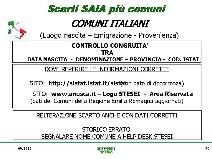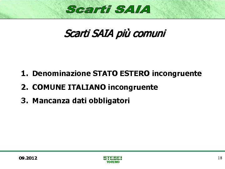 Scarti SAIA più comuni 1. Denominazione STATO ESTERO incongruente 2. COMUNE ITALIANO incongruente 3. Mancanza dati obbligatori 09. 2012 TORINO 18