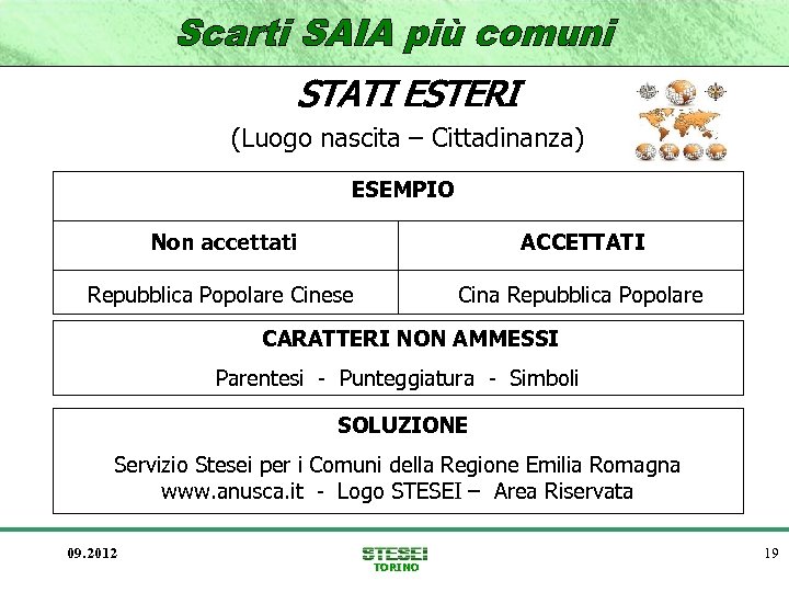 STATI ESTERI (Luogo nascita – Cittadinanza) ESEMPIO Non accettati ACCETTATI Repubblica Popolare Cinese Cina Repubblica Popolare CARATTERI NON AMMESSI Parentesi - Punteggiatura - Simboli SOLUZIONE Servizio Stesei per i Comuni della Regione Emilia Romagna www. anusca. it - Logo STESEI – Area Riservata 09. 2012 TORINO 19