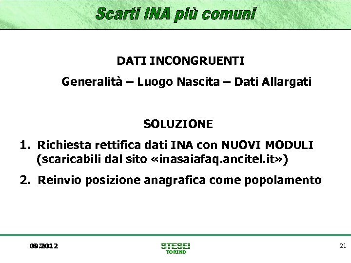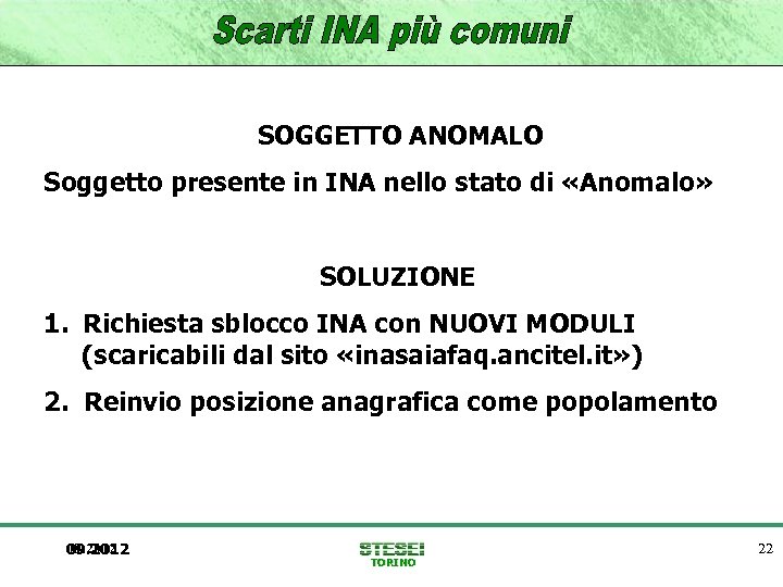 DATI INCONGRUENTI Generalità – Luogo Nascita – Dati Allargati SOLUZIONE 1. Richiesta rettifica dati INA con NUOVI MODULI (scaricabili dal sito «inasaiafaq. ancitel. it» ) 2. Reinvio posizione anagrafica come popolamento 09. 2012 TORINO 21