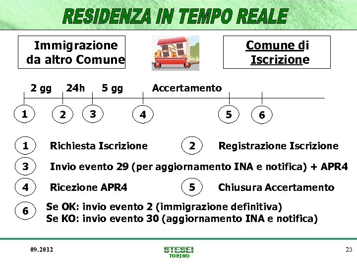 Immigrazione da altro Comune 2 gg 1 24 h 2 Comune di Iscrizione 5 gg 3 Accertamento 4 5 1 Richiesta Iscrizione 3 Invio evento 29 (per aggiornamento INA e notifica) + APR 4 4 Ricezione APR 4 6 2 6 5 Registrazione Iscrizione Chiusura Accertamento Se OK: invio evento 2 (immigrazione definitiva) Se KO: invio evento 30 (aggiornamento INA e notifica) 09. 2012 TORINO 23