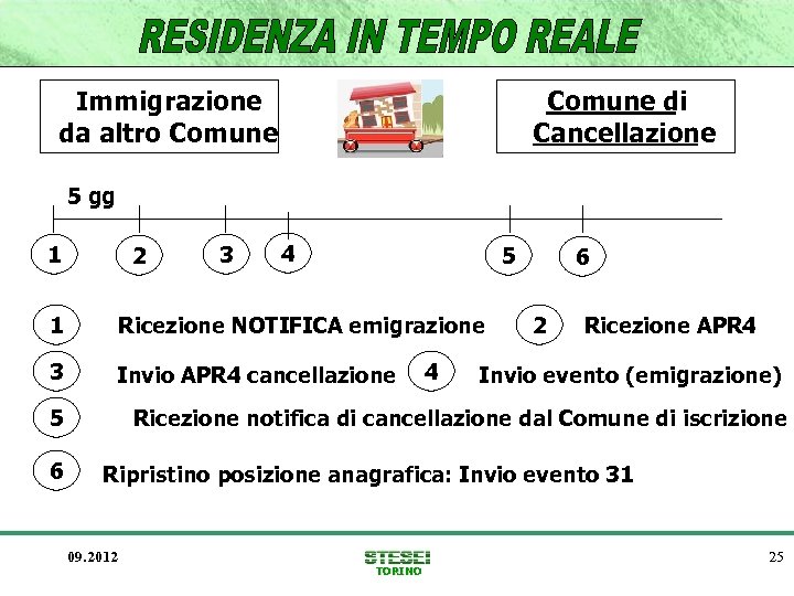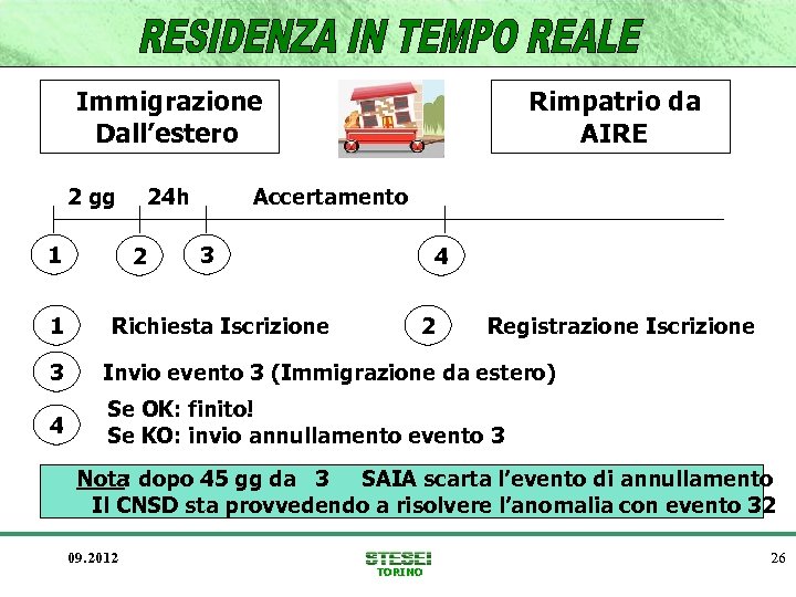 Immigrazione da altro Comune di Cancellazione 5 gg 1 2 3 4 5 1 Ricezione NOTIFICA emigrazione 3 Invio APR 4 cancellazione 5 6 4 6 2 Ricezione APR 4 Invio evento (emigrazione) Ricezione notifica di cancellazione dal Comune di iscrizione Ripristino posizione anagrafica: Invio evento 31 09. 2012 TORINO 25