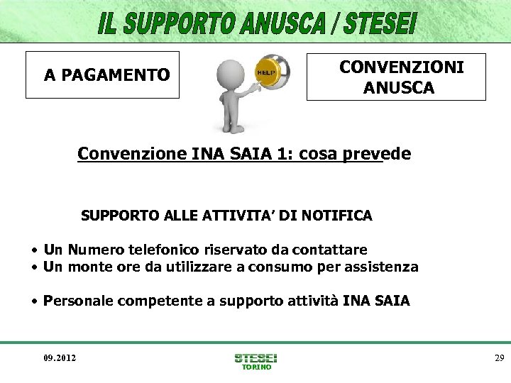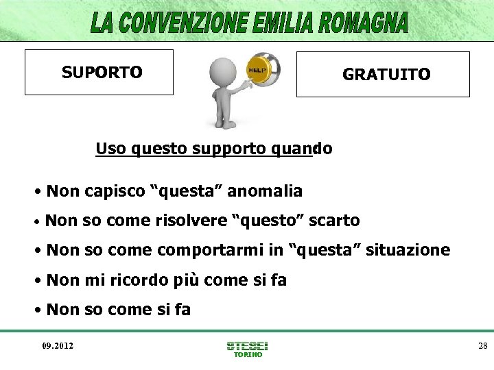 SUPORTO GRATUITO Uso questo supporto quando : • Non capisco “questa” anomalia • Non so come risolvere “questo” scarto • Non so come comportarmi in “questa” situazione • Non mi ricordo più come si fa • Non so come si fa 09. 2012 TORINO 28