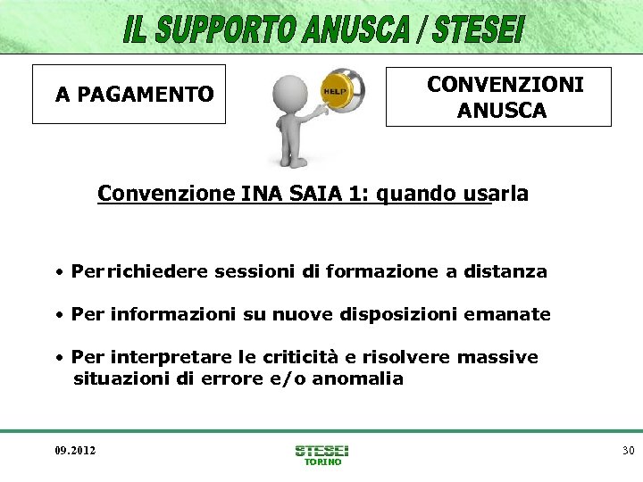 CONVENZIONI ANUSCA A PAGAMENTO Convenzione INA SAIA 1: quando usarla • Per richiedere sessioni di formazione a distanza • Per informazioni su nuove disposizioni emanate • Per interpretare le criticità e risolvere massive situazioni di errore e/o anomalia 09. 2012 TORINO 30