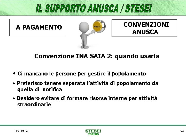 CONVENZIONI ANUSCA A PAGAMENTO Convenzione INA SAIA 2 : cosa prevede GESTIONE POPOLAMENTO STRAORDINARIO INA • Strumenti informatici specifici • Un monte ore da utilizzare a consumo per effettuare il processo di gestione del popolamento con personale specializzato dell’Help Desk STESEI • Una certificazione sulla regolarità dell’attività effettuata 09. 2012 TORINO 31