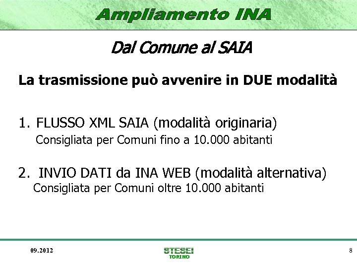 Dal Comune al SAIA La trasmissione può avvenire in DUE modalità 1. FLUSSO XML SAIA (modalità originaria) Consigliata per Comuni fino a 10. 000 abitanti 2. INVIO DATI da INA WEB (modalità alternativa) Consigliata per Comuni oltre 10. 000 abitanti 09. 2012 TORINO 8
