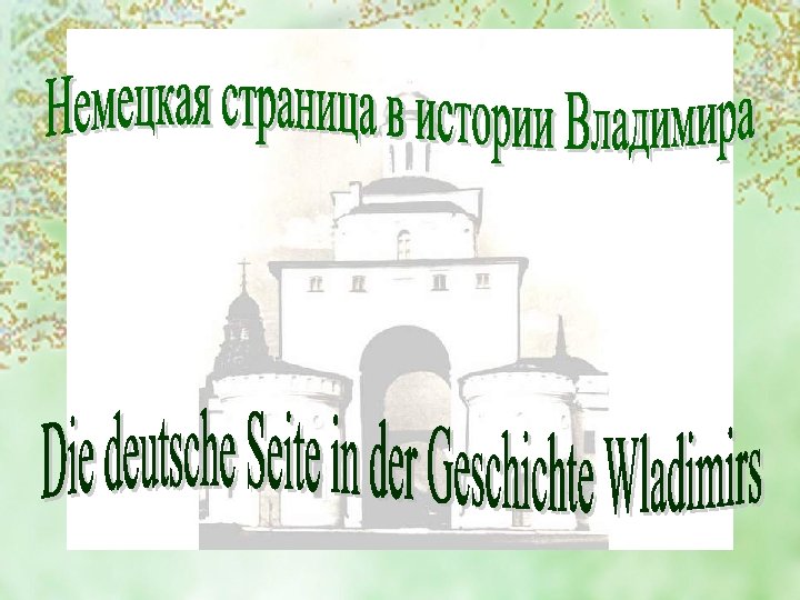Покрестившись в Константинополе, Владимир Красное Солнышко в 988 г. крестил Русь. Примерно в 992… 994 гг. он побывал в Суздальских землях и на месте небольшого поселения на берегу Клязьмы основал город, который в его честь был назван Владимир. Wladimir „Rote Sonne“ taufte die Rus 988. Zwischen 992 und 994 war er in der Gegend um Susdal und gründete am Ufer der Kljasma eine Stadt , die ihm zu Ehren Wladimir genannt wurde.