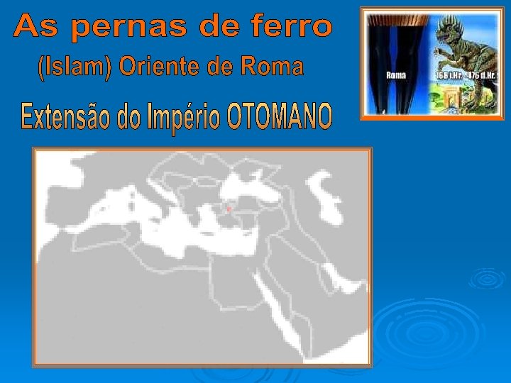 Daniel 2: 34 Estava vendo isto, quando uma pedra foi cortada, sem ajuda de mãos, a qual feriu a estátua nos pés de ferro e de barro, e os esmiuçou. 35 Então foi juntamente esmiuçado o ferro, o barro, o cobre, a prata e o ouro, os quais se fizeram como a pragana das eiras no estio, e o vento os levou, e não se achou lugar algum para eles; mas a pedra, que feriu a estátua, se fez um grande monte, e encheu toda a terra. Estes dois impérios, Otomano e o Império Romano são pés cobertos parte de ferro e parte da argila, serão atingidos e destruídos por Yahushua, que é a Inconfundível Rocha, quando ele voltar em sua segunda vinda para destruir seus inimigos. Esta pedra que destruiu a imagem é o nosso Messias. Tehilim (SAL. 118: 22) a pedra rejeitada pelos construtores, tornou-se a pedra angular.