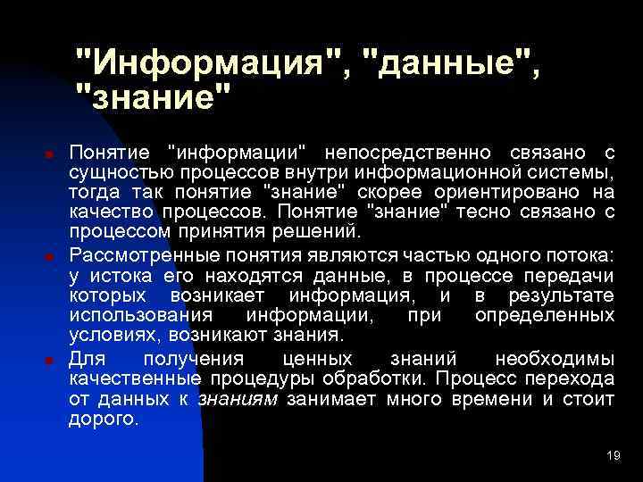 "Информация", "данные", "знание" n n n Понятие "информации" непосредственно связано с сущностью процессов внутри информационной системы, тогда так понятие "знание" скорее ориентировано на качество процессов. Понятие "знание" тесно связано с процессом принятия решений. Рассмотренные понятия являются частью одного потока: у истока его находятся данные, в процессе передачи которых возникает информация, и в результате использования информации, при определенных условиях, возникают знания. Для получения ценных знаний необходимы качественные процедуры обработки. Процесс перехода от данных к знаниям занимает много времени и стоит дорого. 19