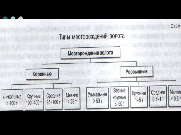 ¢ ¢ ¢ В качестве примеров коренных месторождений можно привести Синюхинское (Алтай, Россия) и Натальевское (Кемеровская обл. , Россия), Юбилейное и Васильевское (Казахстан), Витватерсранд (ЮАР), Керкленд-Лейк (Канада), Моро-Вельо (Бразилия), Коппехед (Австралия). По запасам металла коренные месторождения подразделяются на уникальные, крупные, средние и мелкие. По типу образования коренные (рудные и гидроматериальные) месторождения относятся к первичным, в них золото находится в коренной горной породе. Они образовались в ходе большого круговорота как результат кристаллизации металла их горячих водных растворов, образовавшихся от застывания магмы, когда сульфидная магма, содержащая в себе ряд металлов, в том числе и золото, заполняла трещины в образованном силикатной магмой гранитном массиве. При естественном разрушении золотосодержащих пород коренных месторождений образуются вторичные месторождения, или россыпи – скопления разрыхленных частиц горных пород. По величине запасов россыпные месторождения также подразделяются на уникальные, весьма крупные, средние и мелкие (схема).