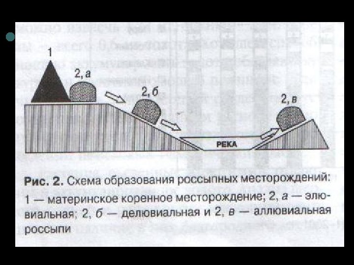 ¢ ¢ ¢ В целом россыпные месторождения содержат золота меньше, чем коренные: уникальные россыпные месторождения (запасы золота более 50 т) соответствуют лишь средним коренным, но в россыпях концентрация золота больше. Редко, но случается, что в средних россыпных месторождениях неожиданно обнаруживают богатейшие скопления золота – легендарные «карманы» или «сундук» . С момента образования россыпь проходит ряд превращений, эволюционируя во времени (рис. ). В геологии принято выделять три типа россыпей элювиальные, делювиальные и аллювиальные (или переотложные). Разрушаясь, породы коренных месторождений под действием меняющейся температуры воздуха, ветра и дождя превращаются в рыхлый материал и образуют россыпи, которые сначала остаются на том же месте, где и материнские породы, и называются элювиальными. Однако под влиянием гравитации и природных факторов материал россыпи отрывается от коренного месторождения и начинает сползать по склону, образуя делювиальную россыпь. Если путь перемещения преграждает протекающая по долине река, то она переносит золото на другое место, где оно, переоткладываясь образует аллювиальную россыпь.