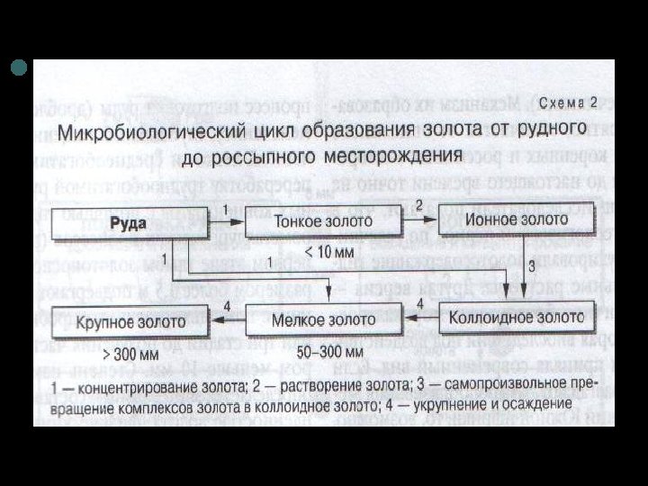 ¢ ¢ Как уже упоминалось, не последнюю роль в трансформации коренного месторождения в россыпное играют микроорганизмы, обладающие избирательной аурофильностью, т. е. способностью извлекать из окружающей среды и концентрировать внутри себя золото (схема). Они выделяют его из горных пород, переносят в грунтовые воды и укрупняют. На микроуровне это происходит следующим образом: клеточная стенка бактерии взаимодействует с коллоидными частицами золота при помощи селективно действующих гликопротеидов. В результате на поверхности бактерии собираются частицы металла, затем происходит их перекристаллизация и они укрупняются в десятки раз. Таким образом, бактерия одевается в «шубу» из микрокристаллов золота. Образующиеся бактериальные организмы срастаются в достаточно крупные агрегаты, которые можно выделить. Так возможно сконцентрировать золото, рассредоточенное в коллоидной системе в виде мельчайших частиц. Затем может происходить растворение тонкого золота под действием органических комплексообразователей: золото переходит из нейтрального состояния в ионную форму. Переход ионного золота в коллоидное состояние благодаря стабилизации органическими соединениями происходит в природе самопроизвольно. Довершает процесс рудообразования работа аурофильных бактерий, которые укрупняют и осаждают частицы коллоидного золота.