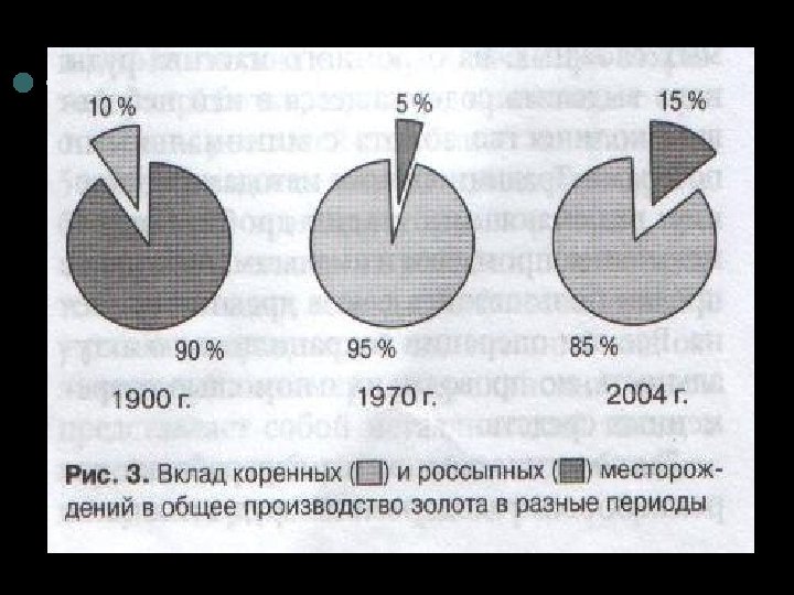 ¢ ¢ Таким образом, при равном содержании золота для добычи россыпи экономически более выгодны, чем коренные месторождения. Не случайно исторически освоение новых золотоносных районов начиналось с добычи золота и россыпи, а после ее истощения переходили к коренному месторождению. Однако, надо отметить, что наряду с достоинствами у россыпного месторождения есть и недостатки: быстрое истощение запасов, небольшие размеры месторождений и их нелокализированность, требующая проведения работ на обширной территории. В разное время приоритет в разработке золота отдавался месторождениям разного типа (рис. ). Более ста лет назад из россыпей добывали почти 90% всего золота. В 70 -е гг. прошлого века их доля составляла не более 3 -5%. В последнее время с открытием новых типов россыпных месторождений их вклад в общее производство золота снова увеличился до 14 -15%. Однако, основными на сегодняшний день считаются коренные месторождения.
