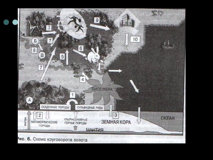¢ ¢ Продолжительность того или иного цикла можно условно оценить по времени, которое необходимо, чтобы вся масса данного вещества могла обернуться один раз на земле в определенном процессе. Для циклических перемещений золота значений этой величины не менее 10000 лет Изучение круговорота элементов, и в частности золота, не только имеет познавательно значение, но и представляет глубокий практический интерес. Последствия …. Растающего антропогенного воздействия стали сравнимы с результатами геологических процессов: в биосфере появляются новые пути миграции веществ и энергии, а так же и новые химически соединения. Создаются новые водные бассейны. В руках человека концентрируются огромные запасы металлов. Меняется обычный ход геохимических процессов. Глубокое изучение всех природных превращений на Земле – необходимое условие рационального воздействия человека на среду его обитания и изменения природных условий в желаемом для нас направлении.