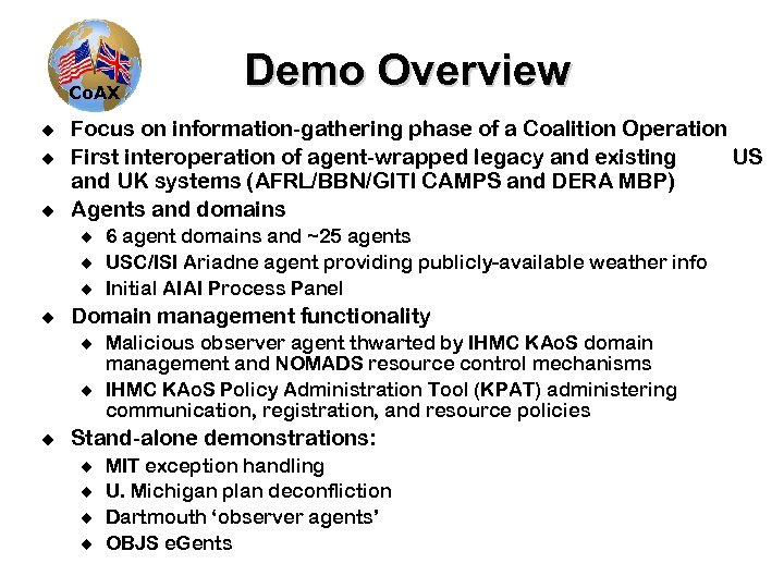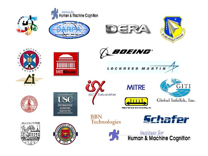 DARPA Co. AX – Coalition TIE Technology Integration Experiment AFRL Rome, AIAI, Boeing, Dartmouth, DERA Malvern, Lockheed Martin ATL, Michigan, OBJS, USC/ISI, UWF/IHMC Support from BBN, GITI, ISX, MITRE, MIT Sloan, Schafer, Stanford Coalition Agents e. Xperiment (Co. AX) http: //www. aiai. ed. ac. uk/project/coax/