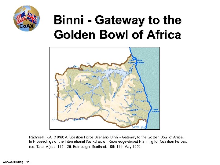 Co. AX Binni - Gateway to the Golden Bowl of Africa Cape Kaso Lagoon. Amstado Cac a Jacal Daka Maw li ca Ca Afram te hi W Amisa Pra a fin O Ka w po Ankobra Cape Vincent Tana aca Black C Rathmell, R. A. (1999) A Coalition Force Scenario 'Binni - Gateway to the Golden Bowl of Africa', In Proceedings of the International Workshop on Knowledge-Based Planning for Coalition Forces, (ed. Tate, A. ) pp. 115 -125, Edinburgh, Scotland, 10 th-11 th May 1999. Co. AX/Briefing - 14