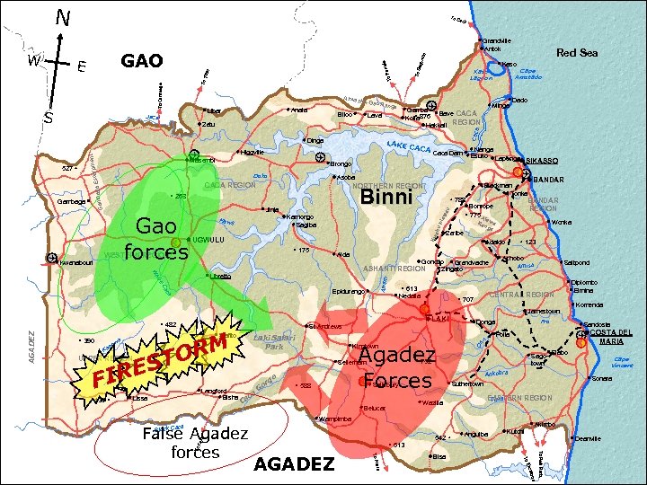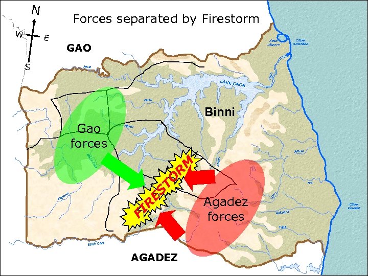 N E Kaso Lagoon GAO S Cape Amstado LAKE Cac a Jacal CACA Daka Binni li Amisa R Agadez forces fin wa po Ka Pra O ES TO R ca Ca M te hi W Afram Gao forces Maw FI W Forces separated by Firestorm Cape Vincent Ankobra Tana aca Black C AGADEZ