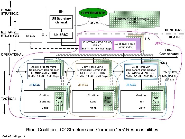 GRAND STRATEGIC UN UN Secretary General Co. AX MILITARY STRATEGIC GOVERNMENTS National Grand Strategic Joint HQs OGDs HOME BASE UN SRSG NGOs THEATRE US JOINT TASK FORCE HQ Joint Task Force (JTF HQ) Commander Staffs: J 1 - 9 + Nat'l Reps JTFC Other Components: OPERATIONAL GAO Joint Force Maritime Component Commander (JFMCC in JFMC HQ) Staffs: N 1 - 9 + Nat'l Reps JFMCC JFLCC Coalition TACTICAL Joint Force Land Component Commander (JFLCC in JFLC HQ) Staffs: G 1 - 9 + Nat'l Reps Maritime Units Nat'l Personnel Joint Force Air Component Commander (JFACC in JFAC HQ) Staffs: A 1 - 9 + Nat'l Reps JFACC Coalition Land Units Nat'l Personnel Coalition Air Units Nat'l Personnel Binni Coalition - C 2 Structure and Commanders' Responsibilities Co. AX/Briefing - 16 LOGISTICS, MARINES, SF etc